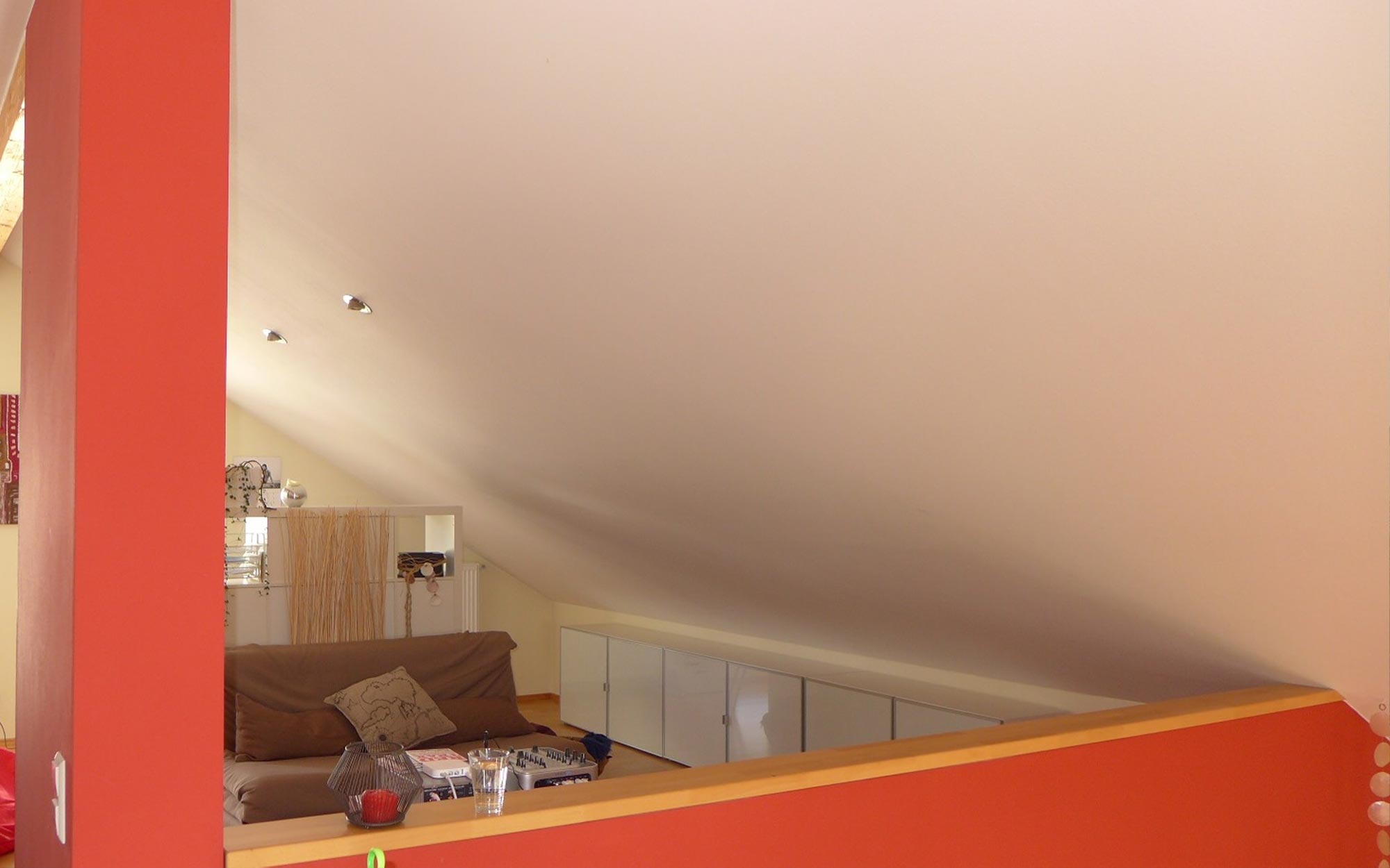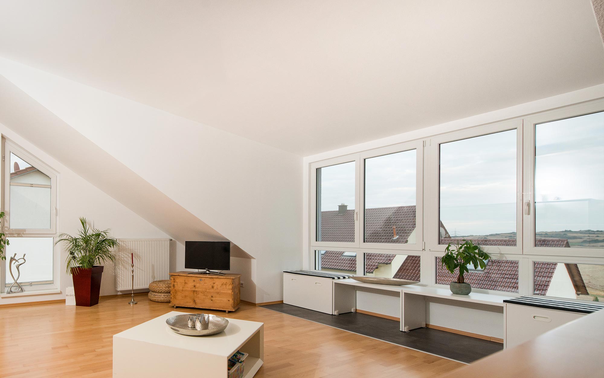 Durch eine großzügig verglaste Schleppgaube nach Süden, ist nun ein gigantisches Zimmer mit viel Licht und einem genialen Weitblick entstanden. Ein wunderschönes Plätzchen um runterzukommen, die Seele baumeln zu lassen und ein Buch zu lesen. Hat man ausreichend Sonne getankt, schützen die Raffstores an der Fensterfront vor direkter Einstrahlung und sorgen trotzdem noch für ausreichend Helligkeit.